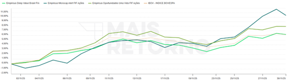 Tal movimento tem sido muito bem capturado por nossos fundos de ações: Empiricus Microcap Alert, Empiricus Oportunidades de Uma Vida e Empiricus Deep Value Brasil subiram 11,8%, 7,9% e 6,4% no mês e acumulam 64,7%, 40,9% e 30% no ano, respectivamente.