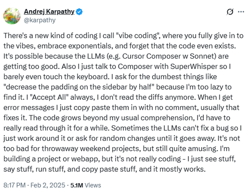 Andrej Karpathy usa o temo Vibe Coding pela primeira vez. Fonte: X