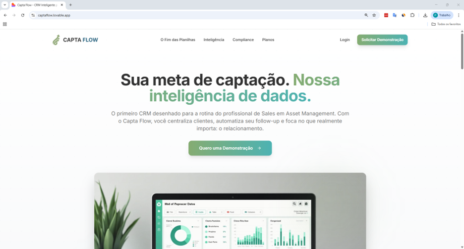 Exemplo de Landing Page criada com apoio do Lovable para uma plataforma fictícia, com base em briefing e logo desenvolvidos no Gemini. Acesso: https://captaflow.lovable.app/