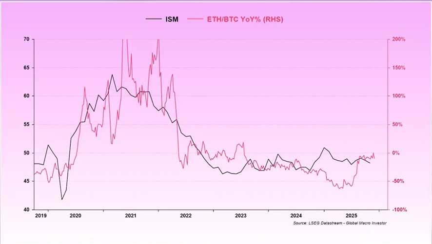 O gráfico acima foi exibido por Raoul Pal, Founder e CEO da Global Macro Investor e Real Vision durante sua apresentação na Solana Breakpoint 2025, e mostra que movimentos de alta no ISM muitas vezes coincidem com melhorias no desempenho relativo de ETH contra BTC, sugerindo que a retomada do ritmo econômico pode criar o ambiente ideal para o início de uma alt season.