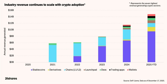 O gráfico mostra como as principais categorias do mercado cripto vêm aumentando sua geração de receita ano após ano. A partir de 2023, fica claro que stablecoins e blockchains (L1/L2) se consolidam como as maiores fontes de receita, enquanto novos setores — como carteiras, apps de trading e derivativos — começam a ganhar mais participação. Em 2024 e especialmente em 2025, a soma de todas as categorias ultrapassa com folga os anos anteriores, indicando um ciclo de adoção muito mais forte.