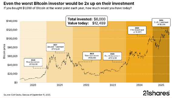 O que esse gráfico evidencia é que, mesmo que você comprasse R$ 1.000 em Bitcoin todo ano no pico anual desde 2020, ainda assim teria duplicado seu investimento.