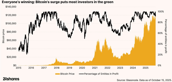 Desde o lançamento dos ETFs spot de Bitcoin, em janeiro de 2024, a porcentagem de entidades que estão ganhando dinheiro com Bitcoin nunca ficou abaixo de 80%, mesmo com os estresses macroeconômicos — como o episódio do carry trade japonês no 3T24, as volatilidades decorrentes das tarifas ao longo do ano ou, mais recentemente, o choque geopolítico somado à paralisação temporária da Binance.