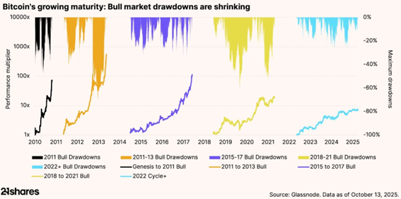 Esse gráfico mostra que o Bitcoin está ganhando maturidade: as quedas nos bull markets estão cada vez menores.
