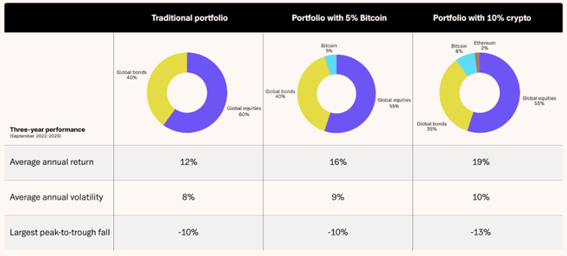 No gráfico abaixo, a 21Shares comparou um portfólio tradicional (60% ações / 40% renda fixa) com outro mais moderno, com alocação em cripto. A comparação é ilustrativa e baseada em dados históricos dos últimos três anos.