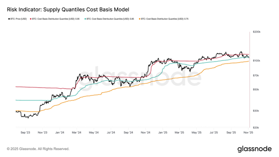 O Bitcoin perdeu suporte no percentil 85 do seu preço de custo (em torno de US$109 mil) e agora está oscilando perto de US$103,5 mil.