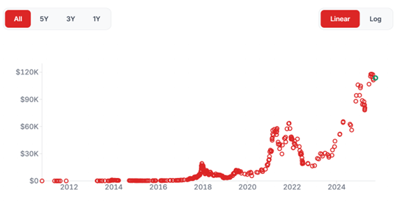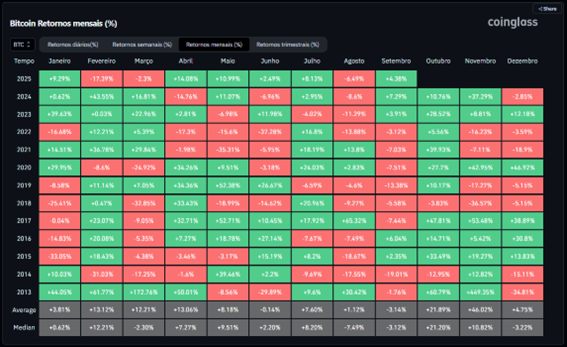 Ao contrário de agosto e setembro, outubro historicamente apresenta forte sazonalidade positiva para o Bitcoin, com retorno médio de 21,89%. Esse movimento costuma ser apenas o início de uma tendência de alta no fim do ano: em novembro, a média histórica de retornos sobe para 46,02%.