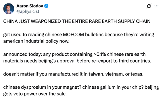 Na manhã de 9 de outubro, foi divulgado que a China estava usando como arma seu acesso a metais de terras raras. Embora o anúncio tenha passado despercebido, recebeu atenção significativa no Twitter.
