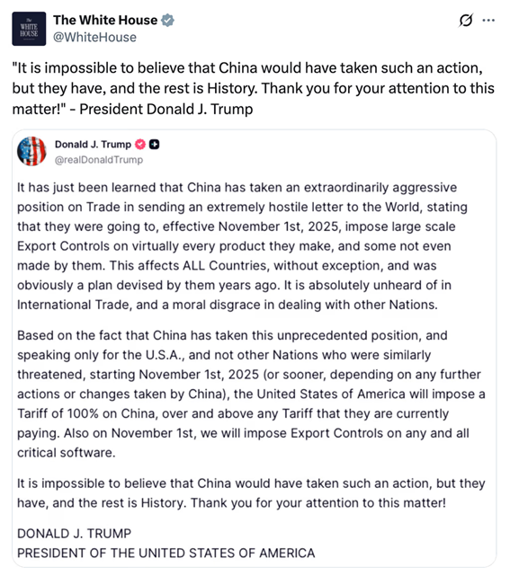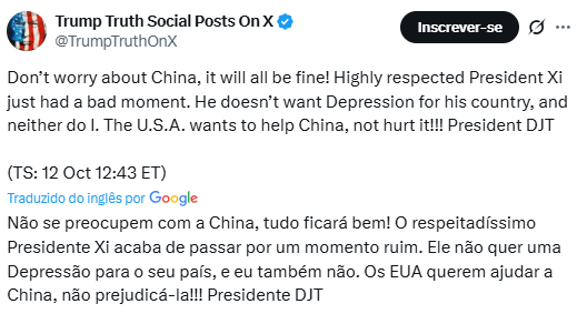 Na sexta-feira, 10 de outubro, Trump anunciou que tarifas de 100% sobre a China começarão a partir de 1º de novembro.