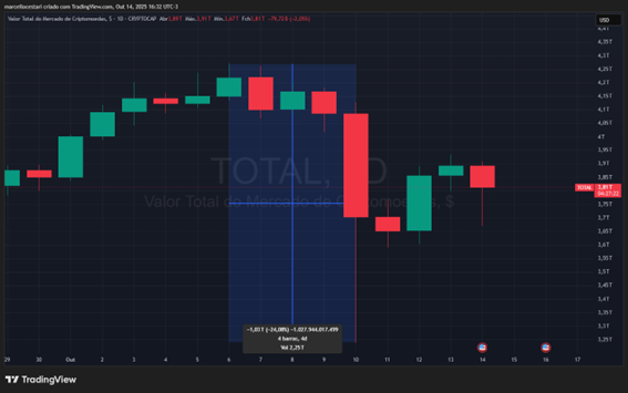 Só na sexta-feira, 890 bilhões de dólares foram eliminados do valor total do mercado de cripto, com a variação total entre a máxima de segunda-feira e a mínima de sexta-feira atingindo -1 trilhão de dólares.