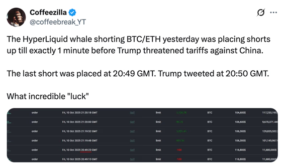 Rolou rumores de informações privilegiadas, uma vez que uma baleia na Hyperliquid estava operando vendido até exatamente 1 minuto antes do Trump ameaçar impor tarifas contra a China, o que é MUITO suspeito, não acha?