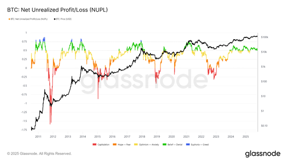 → Se o NUPL = 0,6, significa que 60% do valor de mercado atual representa lucros não realizados. Ou seja, os holders estão ganhando muito, e historicamente esses momentos precedem correções.